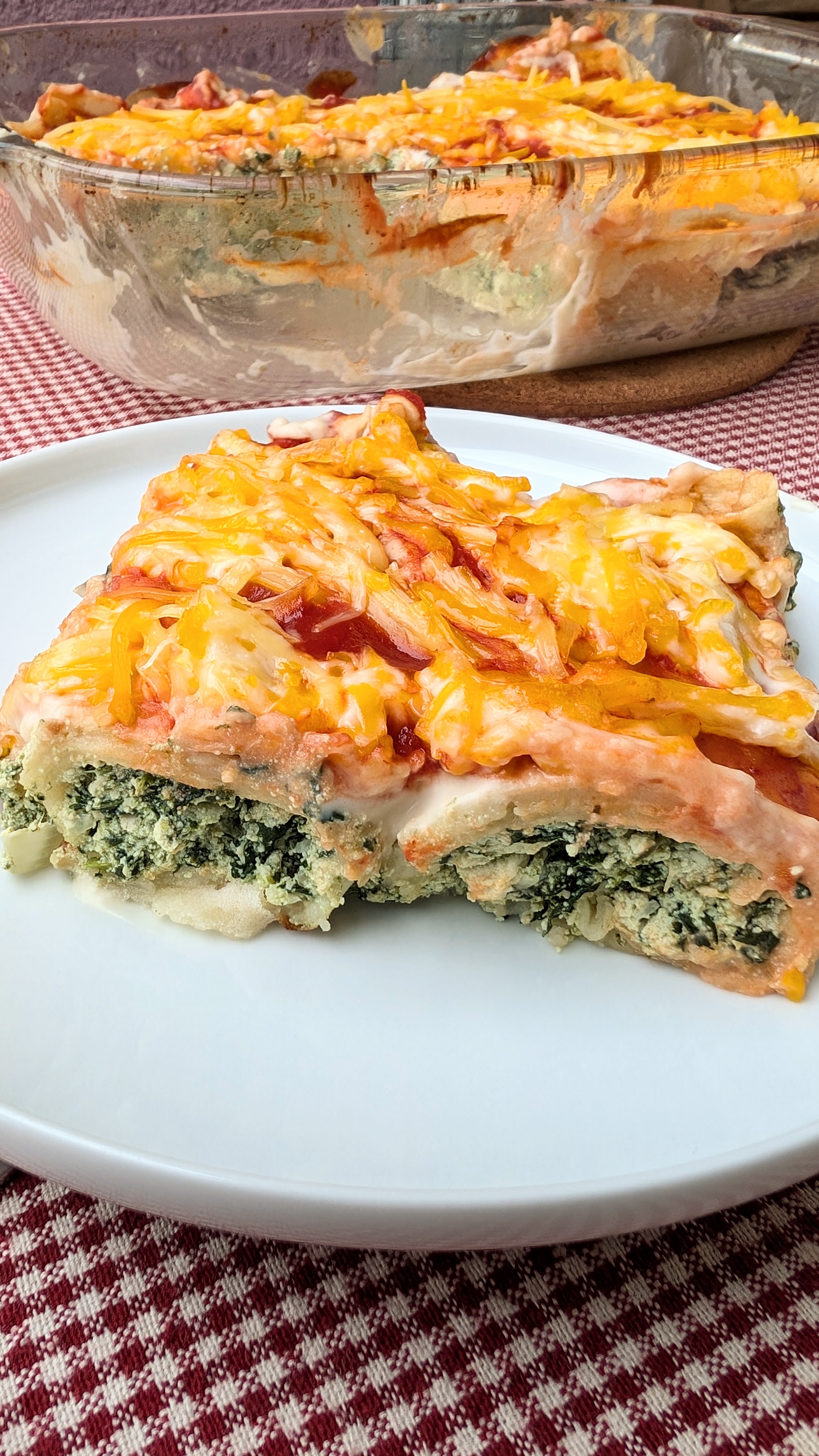 - Sudėjus visus susuktus blynus (~ 6 vnt.) ant jų viršaus pilame ir tolygiai paskirstome Bešamelio padažą, tuomet ištepame pomidorų padažu ir ant paviršiaus pabarstome tarkuoto augalinio sūrio (kad augalinės sūrio alternatyvos geriau lydytųsi jas rekomenduojame sumaišyti su 1-2 v. š. majonezo).